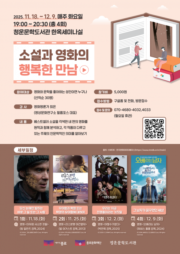 청운문학도서관에서 소설과 영화를 사랑하시는 이용자 분들을 위한, 소설을 모티브로 한 네 편의 영화에 대한 강의를 준비했습니다.