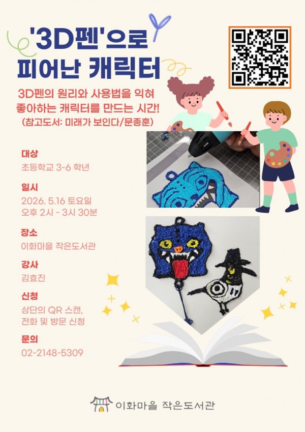 안녕하세요! 이화마을 작은도서관에서 초등학생 친구들을 위한 재미있는 3D펜 체험 프로그램을 준비했습니다.